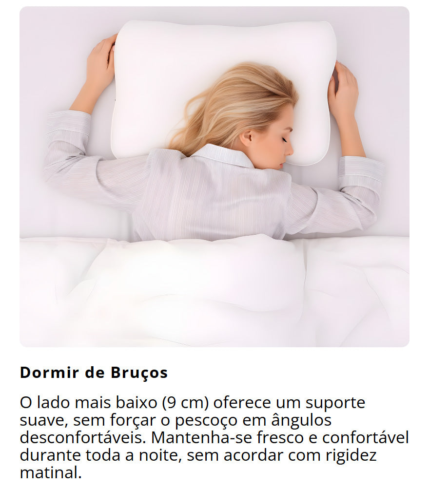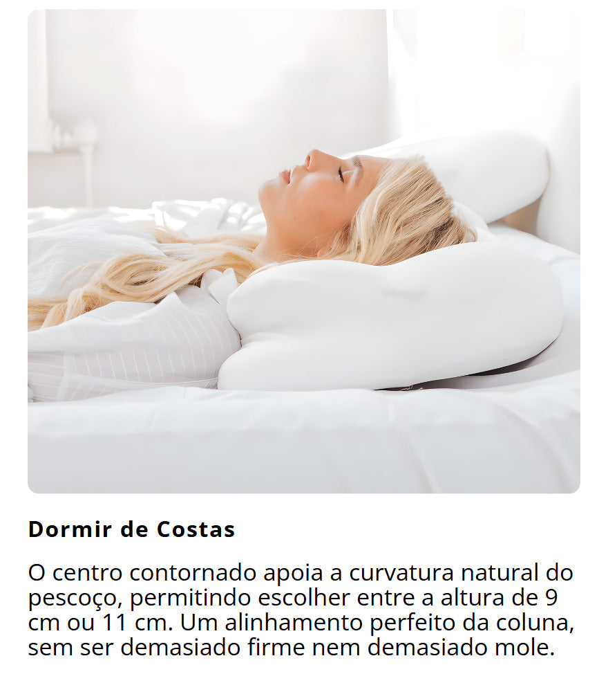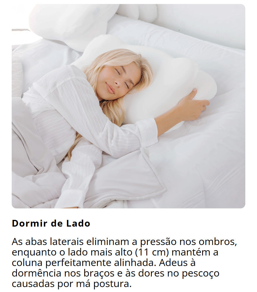 Uma má geometria da almofada obriga o seu pescoço a compensar toda a noite. A almofada Cloud Align mantém a curvatura cervical neutra e oferece espaço para os ombros em quem dorme de lado. Menos compensação, mais descanso verdadeiro.